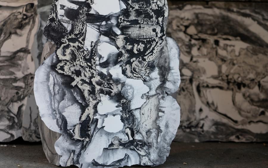 For the casts, I need a smooth and solid surface. All of the exhibited works were cast on a mirror. I first paint on the surface, with the consistency of the paint having a major influence on the final image. I use different black paints, which may look similar but react very differently to the casting material, which consists of either plaster or a calcium sulfate mixture. During casting, movements emerge that are captured – pigments drift apart, dissolve, and recall tectonic and spherical dynamics.